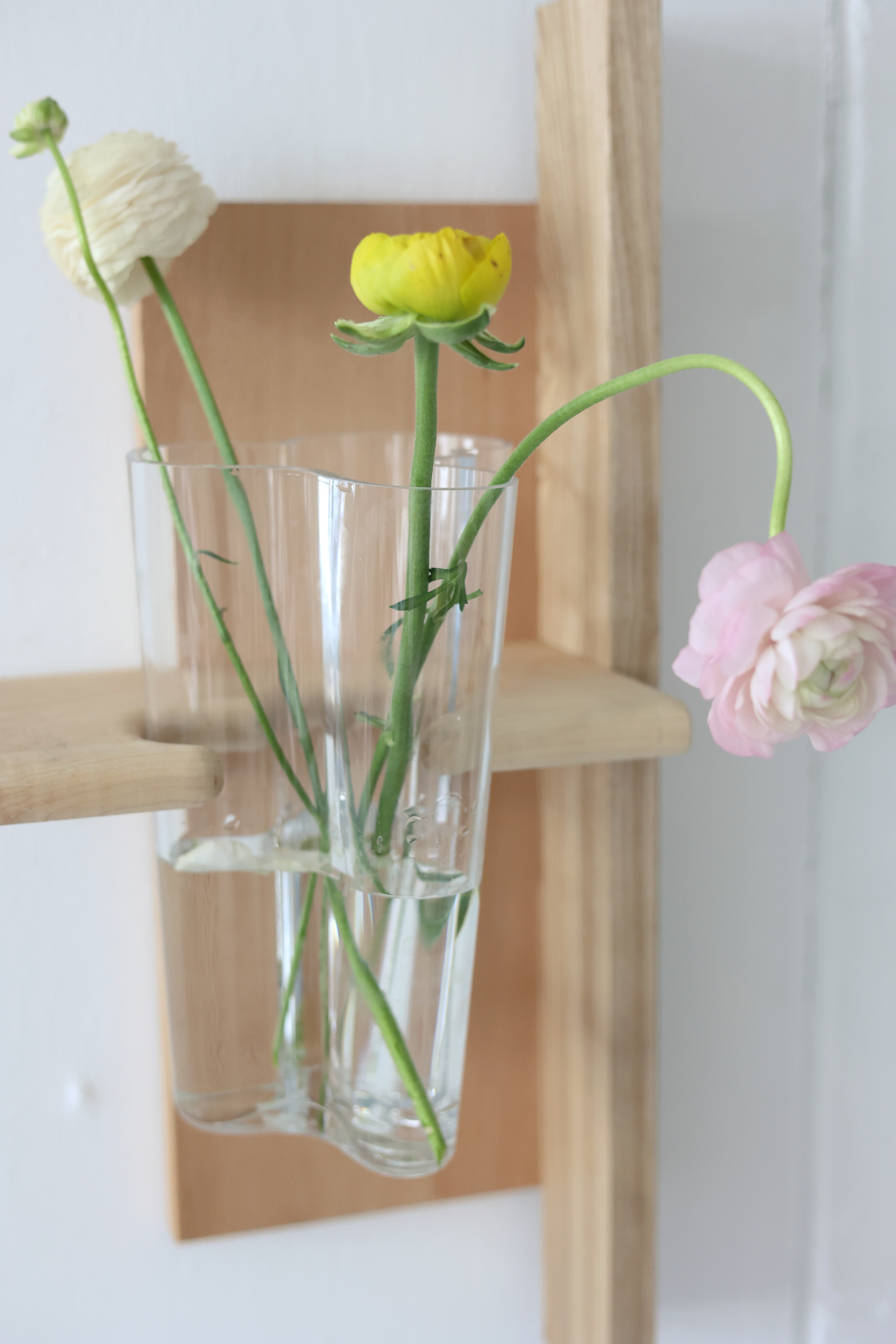 The Aalto Shelf is designed to hold the Aalto 251mm vase in order to allow flowers to be wall mounted and kept out of reach of small children and animals. Made to fit the contours of the 251mm Aalto vase. As the vessel is hand blown into a mold, its organic yet regular tapered shape can be used as a way of suspending the vase from a single horizontal plane.